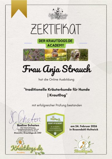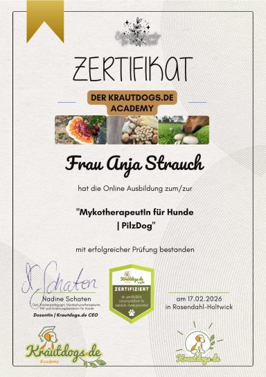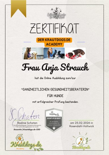 Um meine Leidenschaft auf ein professionelles Fundament zu stellen, habe ich mich im letzten Jahr dazu entschlossen, die Ausbildung zur ganzheitlichen Gesundheitsberaterin für Hunde zu absolvieren.