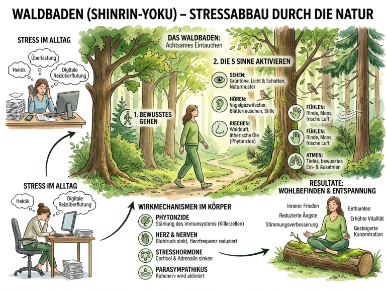 Stressabbau: Das Grün der Bäume und die Waldluft senken nachweislich den Cortisolspiegel und regulieren Blutdruck sowie Puls.