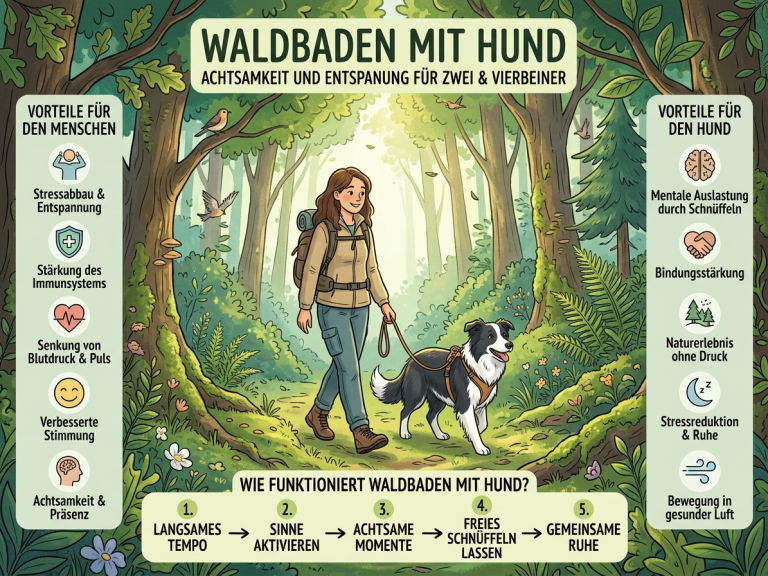Beim Waldbaden mit Hund (japanisch: Shinrin Yoku) geht es nicht um sportliches Gassi gehen, sondern um das bewusste, absichtslose Eintauchen in die Waldatmosphäre. Während du tief durchatmest und die Ruhe genießt, darf dein Hund in seinem Tempo schnüffeln und die Natur erkunden.